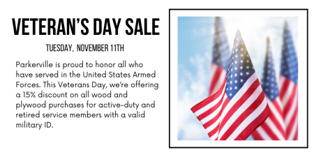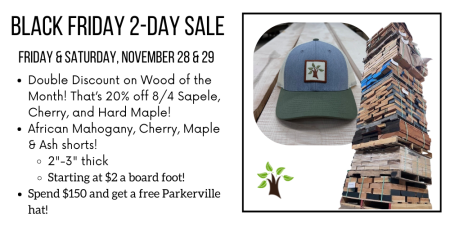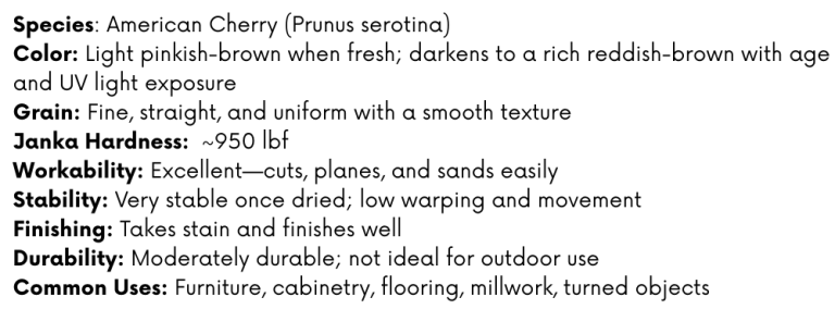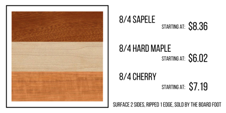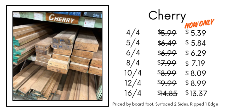 In celebration of President’s Day, our selection of 4/4 Cherry is on sale!  Regular 4/4 Cherry is discounted to $3.99 bf with 8+” wide at $4.49.